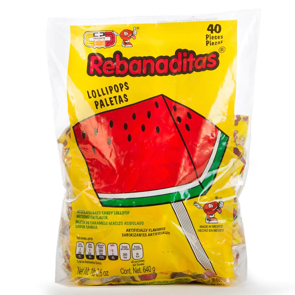 Enjoy a taste of Mexico with Rebanaditas Watermelon Lollipops. Made with watermelon flavor and a touch of spicy chile, these 40ct lollipops are a perfect balance of sweet and tangy. Perfect for a unique and flavorful treat!